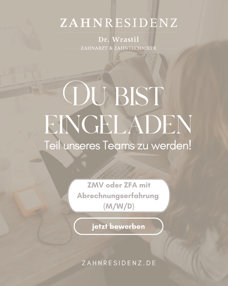 In der Zahnresidenz suchen wir eine ZFA mit Erfahrung in der Abrechnung oder eine ZMV (m/w/d), die Freude an Struktur, Organisation und einem wertschätzenden Miteinander hat.